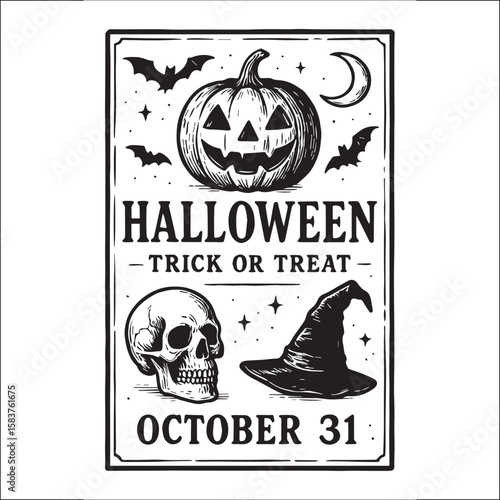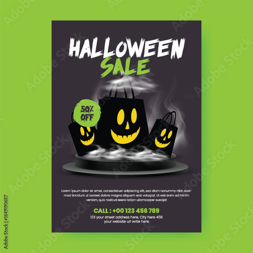Happy Halloween greeting card with vector graveyard and creepy pumpkin jack-o-lantern illustration. Invitation poster for sale promotion marketing campaign or holiday celebration