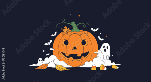 Happy Halloween party celebration, flat vector illustration. Giant pumpkin and tiny people in Halloween costumes trick or treating sweets.
