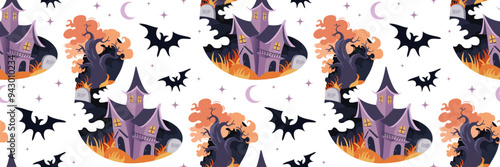 Flying bats, cute Boo ghosts, night background with cemetery with graves and dead tree, vector illustration in paper art style. Happy Halloween composition for party invitation, poster, banner etc.