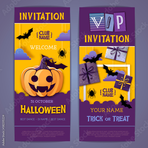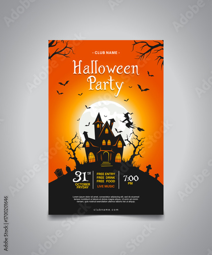 Happy Halloween vector greeting card with spooky castle. Haunted house and flying bat over night sky with moon illustration. Creepy October holiday celebration
