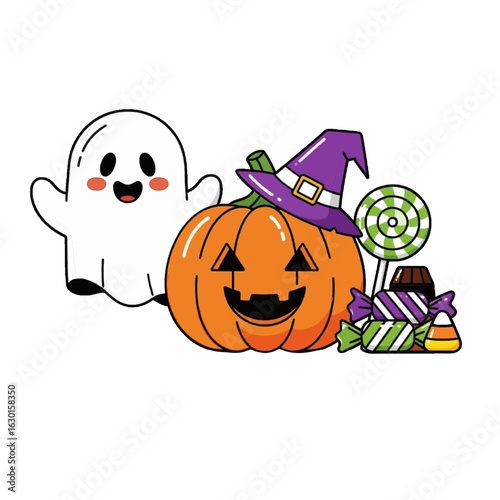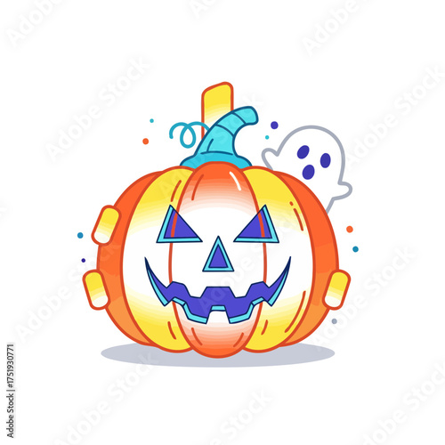Huge scary pumpkin and happy male and female characters having fun, vector illustration. Happy Halloween concept for web banner, website page etc.