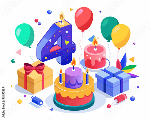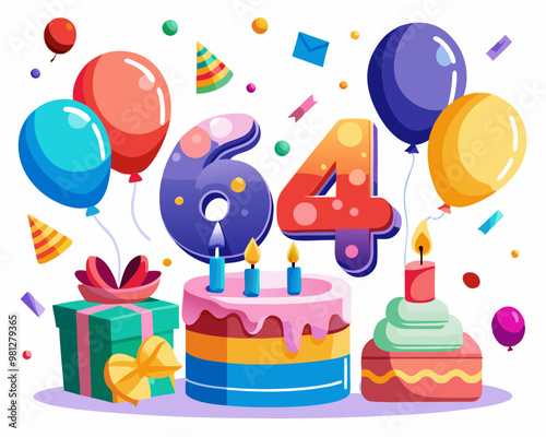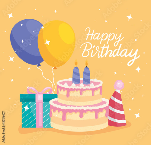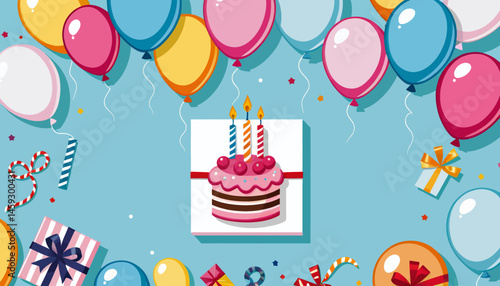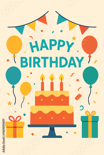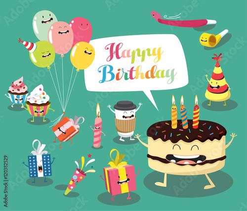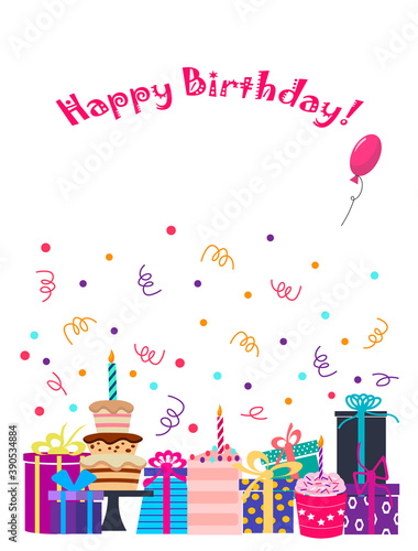 Happy holidays vector flat illustration. Holiday cake and hats, wine, gift boxes, balloons, dollar coins and confetti. Greeting card, celebration poster, banner.