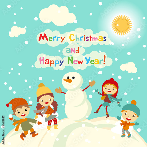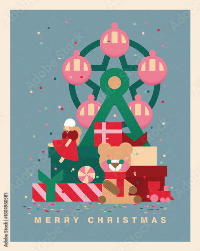 Happy holidays vector flat illustration. Birthday cake with number one, teddy bear, party hats, balloons, gift boxes, baby dummy, dollar coin. First birthday greeting card, celebration poster, banner.