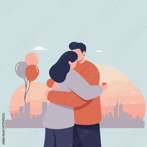 Happy loving couple hugging on beach, flat vector illustration. Romantic vacation, summer beach holiday, honeymoon.