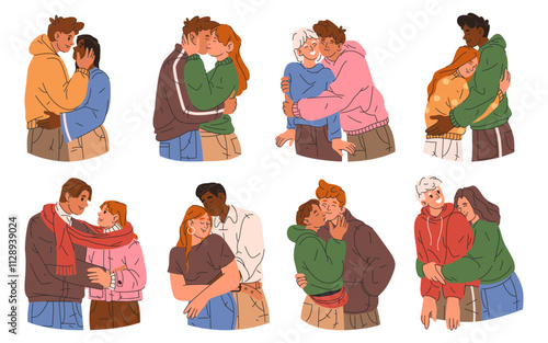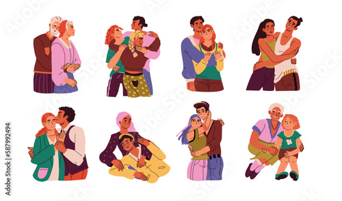 Happy loving senior married couple hugging feeling adoration and romantic emotion vector illustration. Portrait of old man and woman hugging together isolated on white background. Love relationship