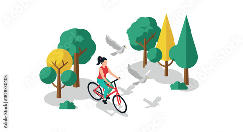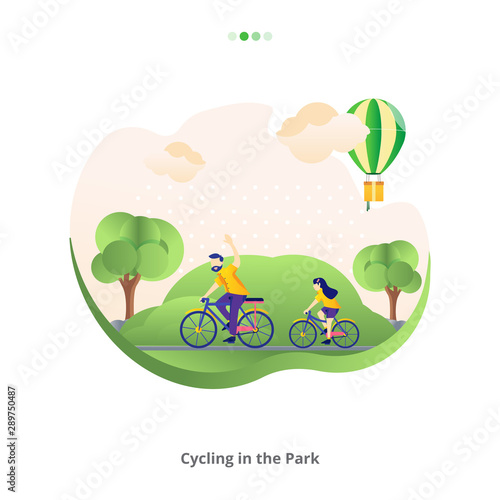 Happy male characters riding bicycle and walking pet dog in city park, vector flat illustration. Active and healthy lifestyle, summer outdoor activities.