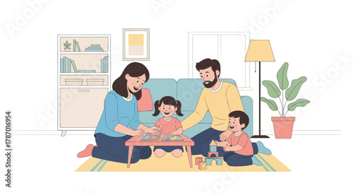 Happy mother playing with son and pet dog at home, flat vector illustration. Mom and kid spending time together. Parent child relationship, happy motherhood and parenting.