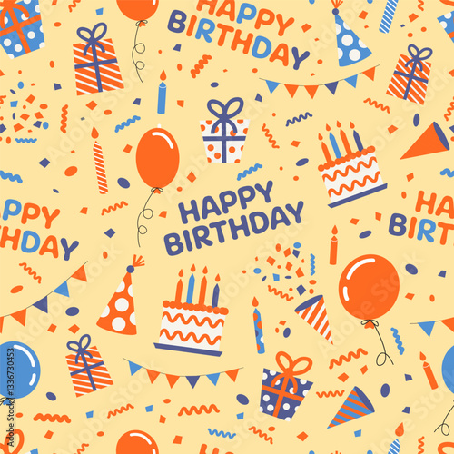 Happy new year greeting banner or poster over festive seamless pattern with colorful holiday accessories and sweets vector illustration design