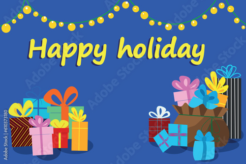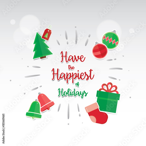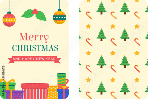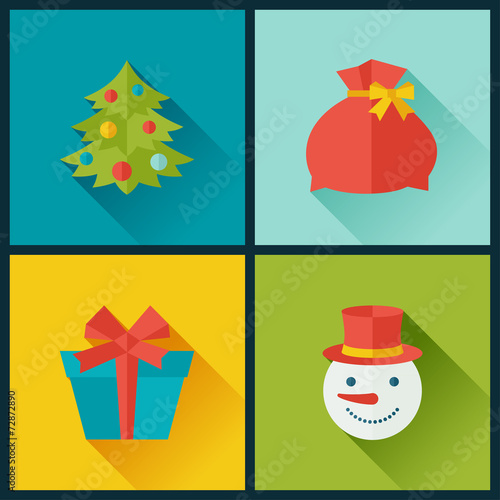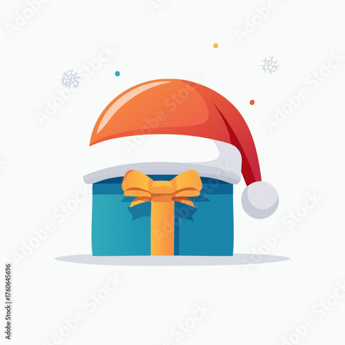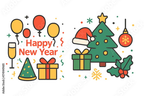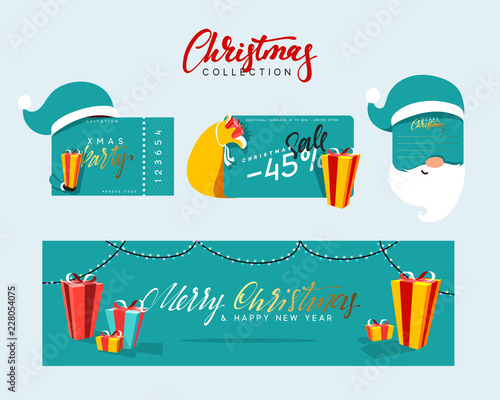 Happy New Year vector flat style design illustration. Santa hat, beard and mustache, gift boxes, christmas stocking, tree, candles, star. Winter holidays composition for web banner, website page etc.