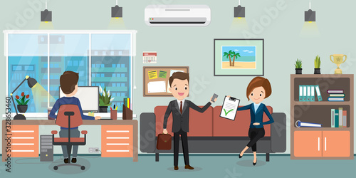 Happy people buying gifts at shopping mall, flat vector illustration. Male and female characters going shopping preparing for New Year and Christmas holidays celebration.