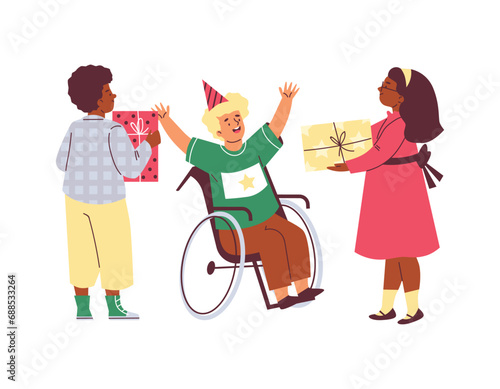 People celebrating Christmas party, flat vector isolated illustration. Family characters adults and kids, colleagues, friends dancing and having fun. Winter holidays celebration.