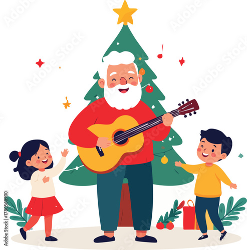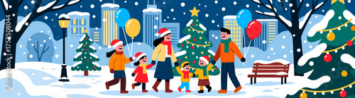 People celebrating Christmas party, flat vector isolated illustration. Family characters adults and kids, colleagues, friends dancing and having fun. Winter holidays celebration.