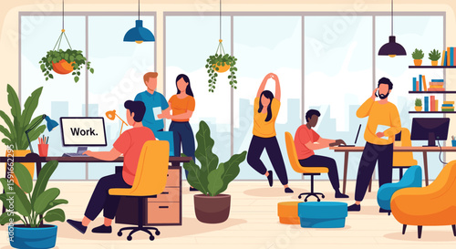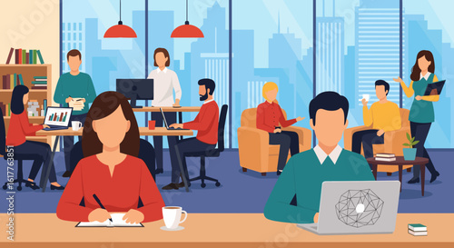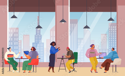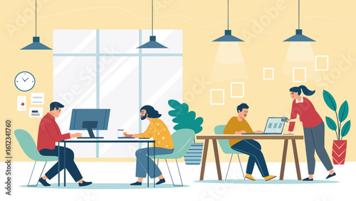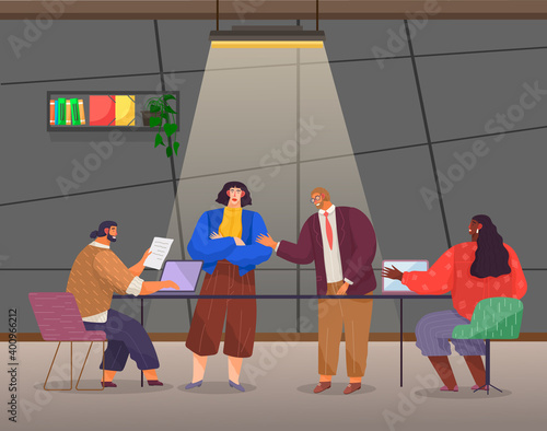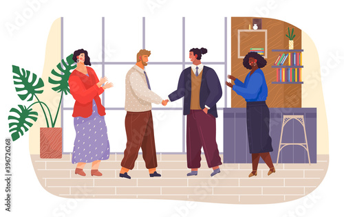 Happy people celebrating Easter at home, flat vector illustration. Family characters welcoming guests. Spring holiday celebration with friends and traditional Easter cake and painted eggs.