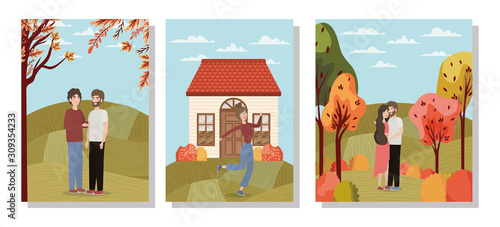 Happy people giving and receiving gifts, vector posters set. Family present gift to kid for birthday party. Man gives giftbox to his girlfriend, romantic couple. Hands holding gift box with ribbon.