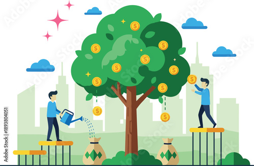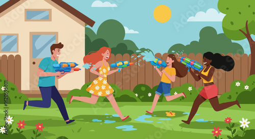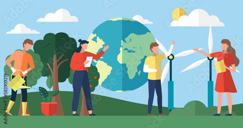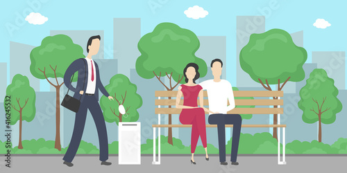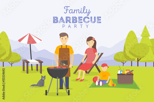 Summer hiking and bbq. Happy people reading books while lying in hammock and on blanket, grilling sausages, flat vector illustration. Barbecue party, outdoor picnic, camper van travel, summer camp.