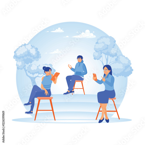Happy male and female cartoon characters making cute snowman, playing snowballs and having fun, flat vector illustration. Winter time outdoor activities. New Year and Christmas winter holidays.