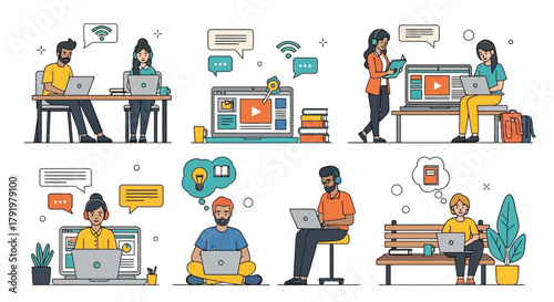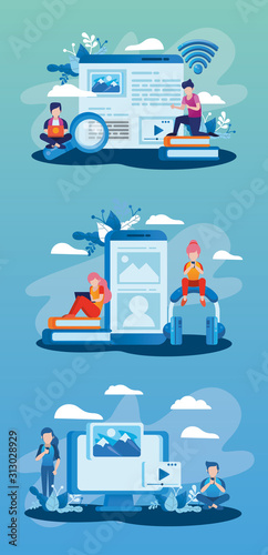 Happy people sending and receiving presents, flat vector illustration. Fresh flowers, pizza, gift box. Birthday, anniversary, romantic presents. Online gift delivery service.
