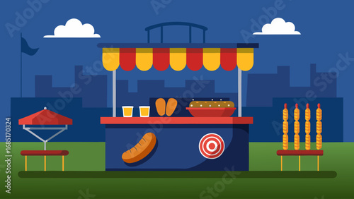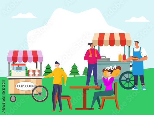 Happy people taking rest in city park, flat vector illustration. Male and female characters having picnic, eating grilled meat and street food. Bbq party, summer camp, weekend, outdoor leisure.