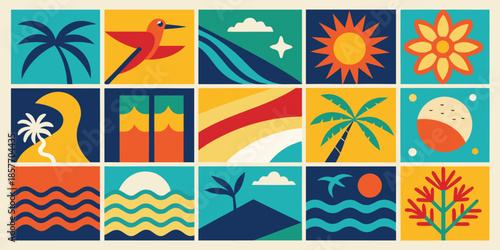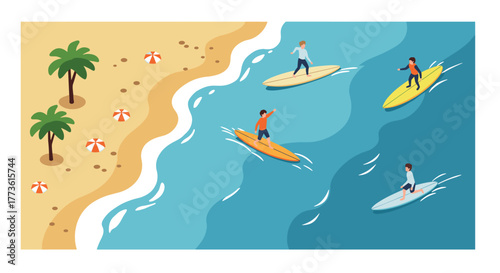 Happy people tourist surfing enjoying beach activities scene set. Man and woman surfers in beachwear riding surfboards vector illustration. Vacation time on tropical resort