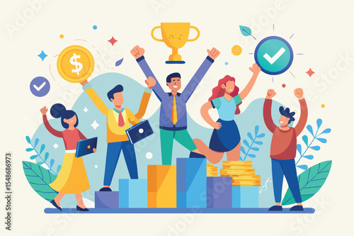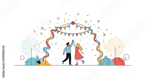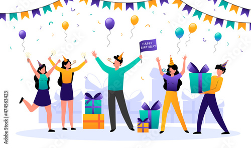 Happy people with disabilities dancing, flat vector illustration. Birthday party. Disabled man and woman in wheelchairs having fun together with friends. Disabled people lifestyle.