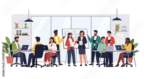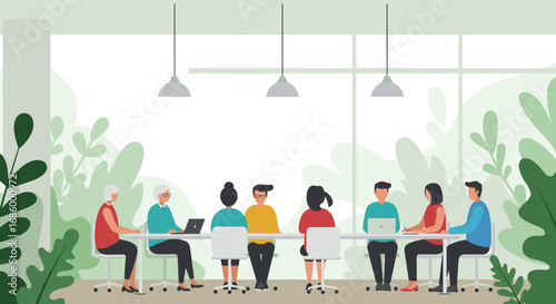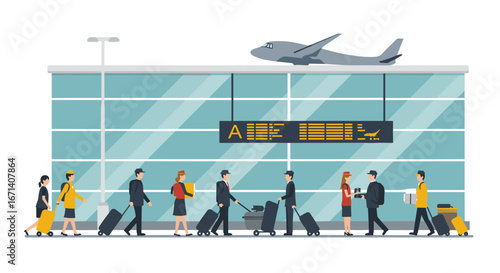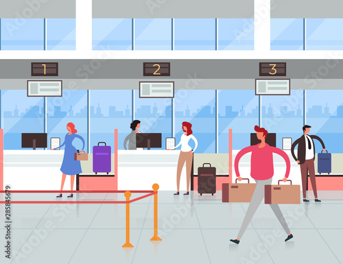 Happy passengers with luggage at the airport check in counter, flat vector illustration. People checking in for valid travel documents such as tickets, visa, passport.