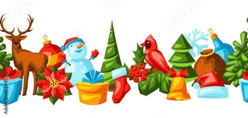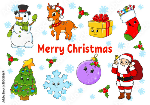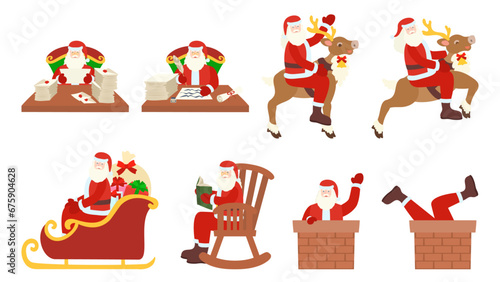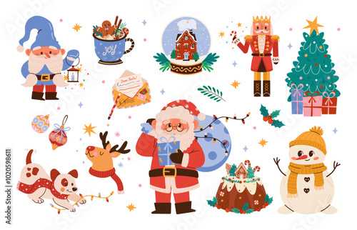 Merry Christmas set, flat vector isolated illustration. Happy Santa Claus with gifts, chinese zodiac 2021 sign, cute ox ice skating, ringing the bell, holding sparklers. Happy New Year celebration.