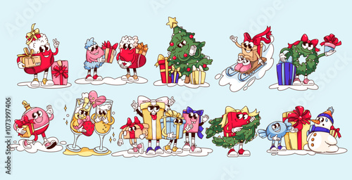 Merry Christmas set, flat vector isolated illustration. Happy Santa Claus and cute ox, chinese zodiac 2021 sign with gifts, Christmas tree, ball, wreath, bell. Happy New Year celebration.