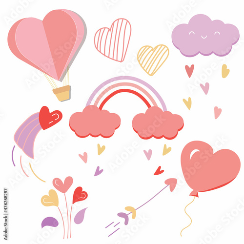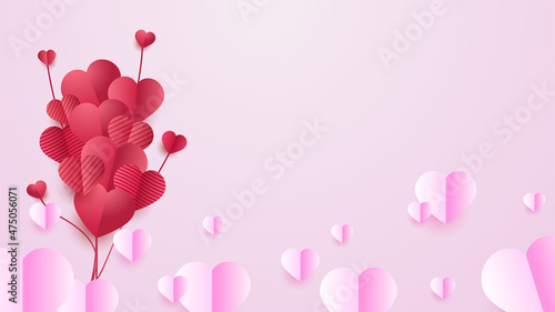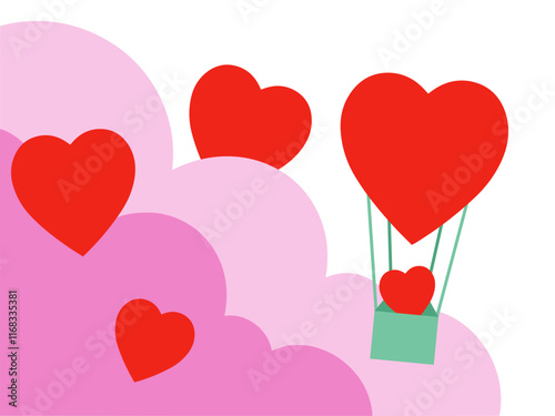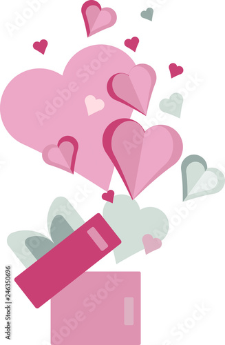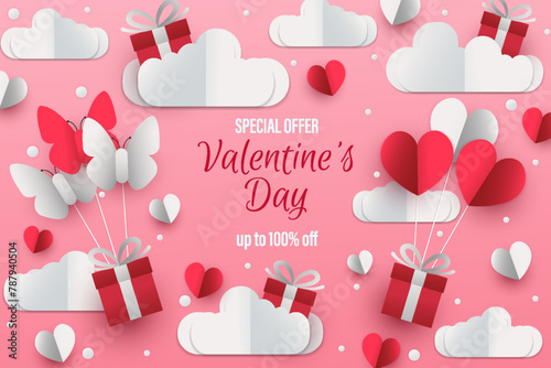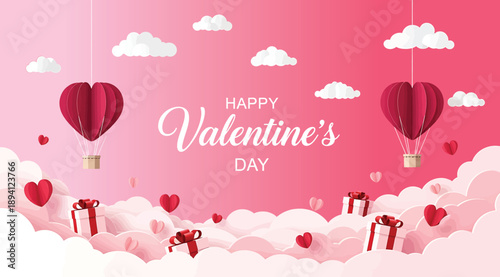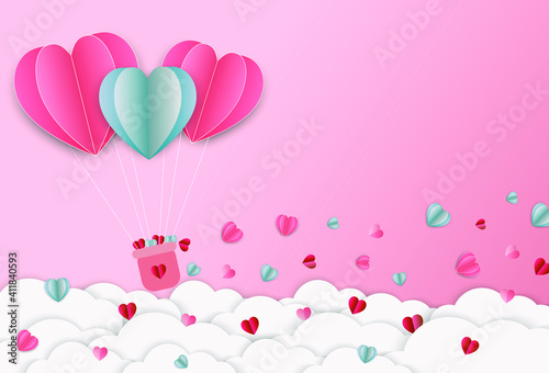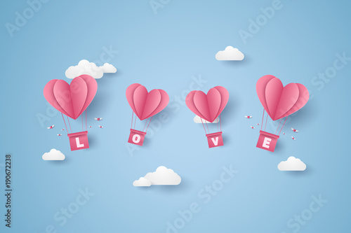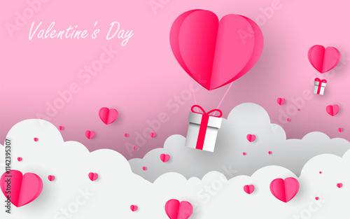 Open love gift box with hearts, hot air balloons, ribbons flying out of it. Vector illustration in paper art craft style. Romantic love. Happy Valentines Day greeting card, poster, banner template.