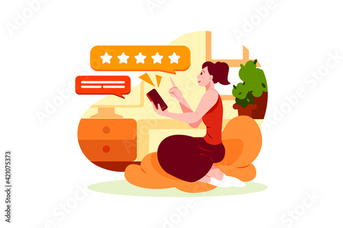 Happy woman customer advertising fastfood order mobile digital service vector illustration. Cheerful excited customer holding smartphone rejoicing benefits of trendy online food delivery app