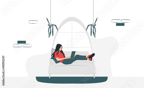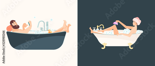 Happy woman taking bath lying in bathtub with mobile phone in hand, flat vector illustration. Home bathroom interior. Young people lifestyles. Social media and smart phone addiction.