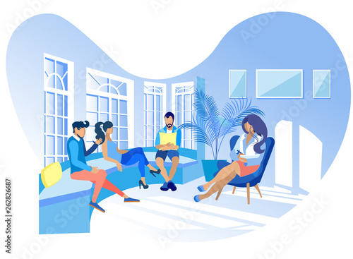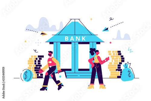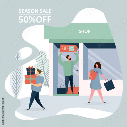 Happy women shopping, flat vector illustration. Shop building. Beautiful ladies carrying shopping bags with purchases.