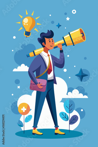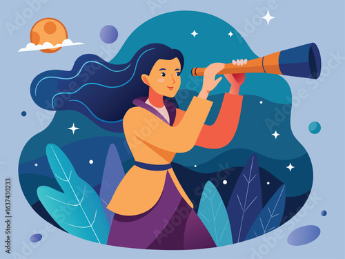 Happy young couple exploring starry sky looking through telescope spending time together during romantic dating outdoors vector illustration