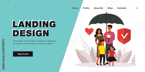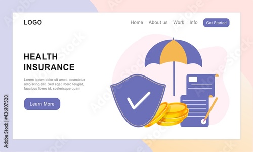 Health insurance vector website template, web page and landing page design for website and mobile site development. People, health insurance policy, shield under umbrella.