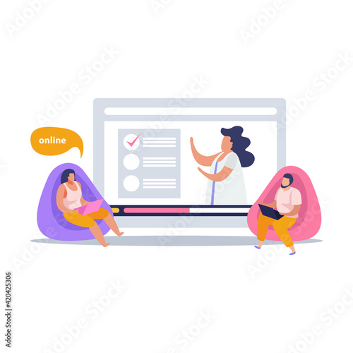 Healthcare vector concept illustration. Doctor discussing with his patient tests results for diagnosing heart conditions, apple, etc. Medical help, diet, healthy eating and fitness for healthy heart.