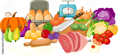 Healthy food product for breakfast, lunch or dinner preparation set. Ripe fresh fruits and vegetables, raw chicken an pork meat, sliced seafood, hard cheese head and filtered water, bottled milk