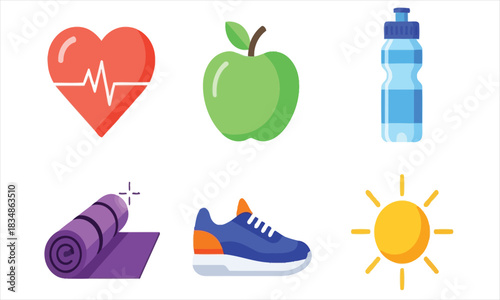 Healthy lifestyle vector poster. Fitness equipment, sport training stuff and accessories, dieting food product illustration
