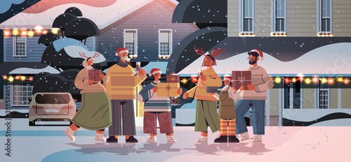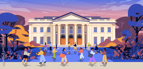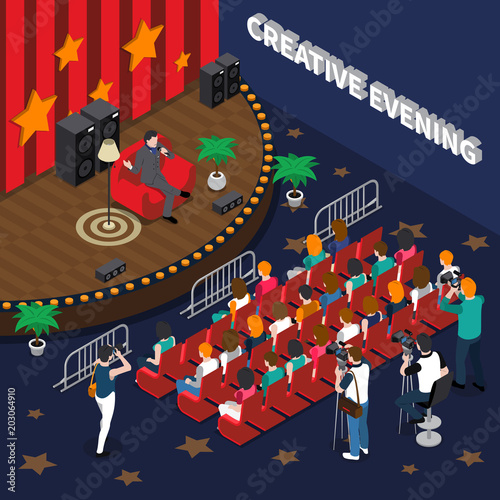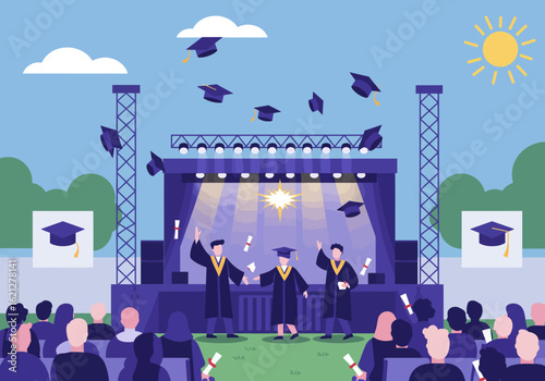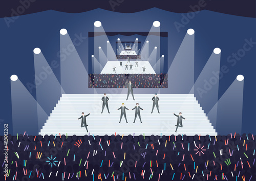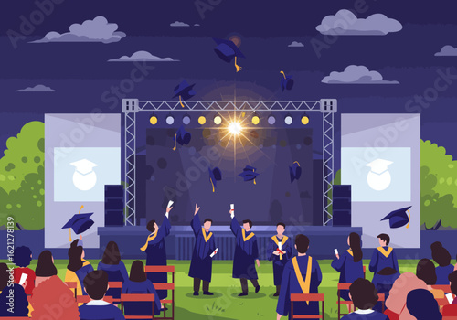 Heavy metal rock festival celebration vector illustration. Open air party in city park with musical band performing on stage, excited crowd of people dancing under starry night sky