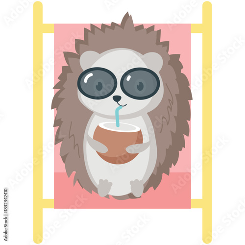 Hedgehog rest on beach vector. Cute forest prickly animal drinking coconut cocktail sunbathing on deckchair enjoy summer relax on tropical seaside illustration isolated on white background