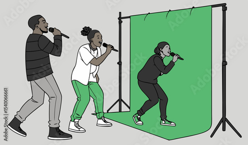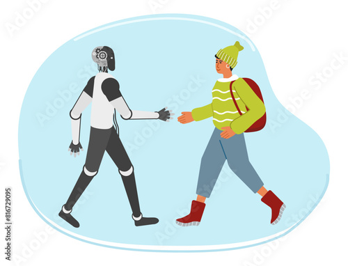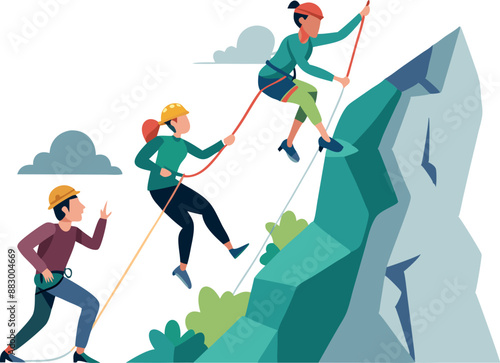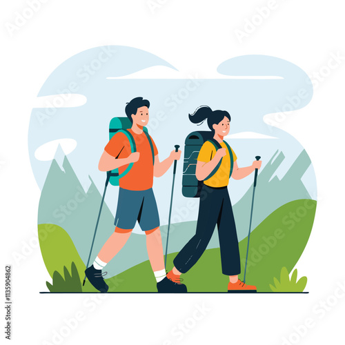 Hiking scene, flat vector illustration. Traveler, hiker couple with backpacks, camera, water bottles going hiking in forest. Trekking, mountain tourism, adventure, expedition, nature discovery.