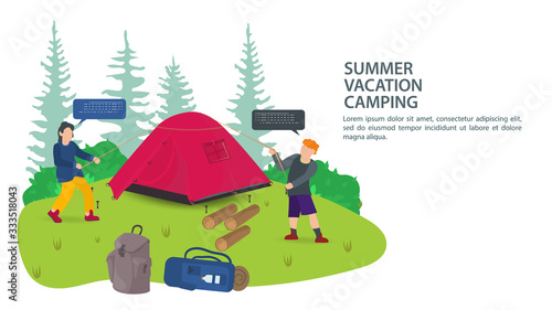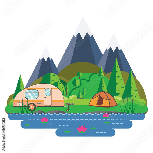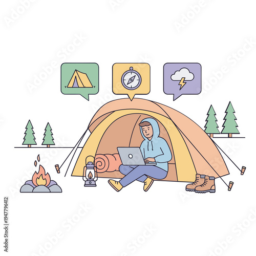 Hiking scene, flat vector illustration. Traveler, hiker female character sitting at campfire with cup of hot tea. Trekking, nature tourism, adventure, expedition, camping.