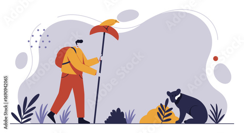 Group of tourists sitting near tent and cooking meal on fire, vector illustration. Camping, hiking, trekking concept for web banner, website page etc.
