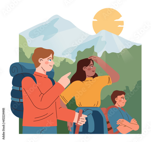 Historical museum excursion for schoolkids with guide. Exposition of stone age family couple cooking meat on open fire next to their cave home. Vector flat style design illustration.