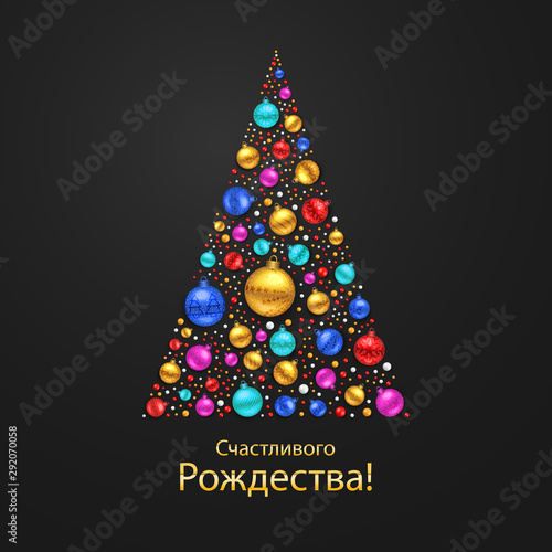 Holiday Christmas and New Year card template. Vector poster with hand drawn symbols. Gift boxes form Christmas tree.