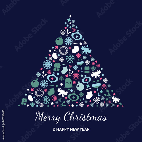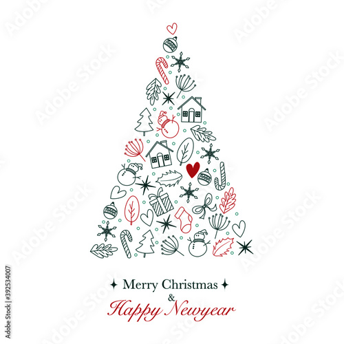 Holiday Christmas and New Year card template. Vector poster with hand drawn symbols. Gift boxes form Christmas tree