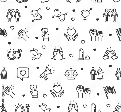 Holiday Christmas and New Year line seamless pattern. Vector illustration of wrapping paper in linear style design. Graphic icons with toys and gifts elements.