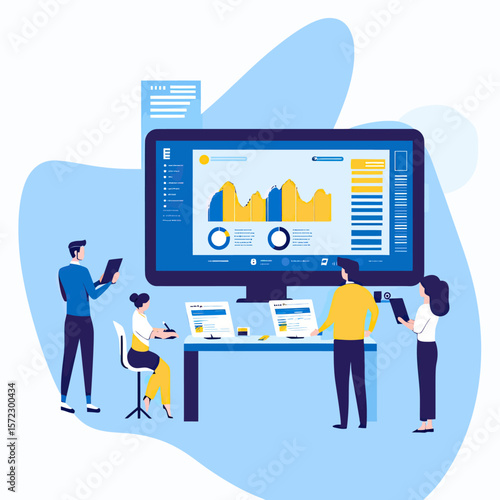 Kitchen and home appliances online sale, vector illustration. E-commerce concept, online shopping composition with micro characters buying household equipment tv sets, kettle from huge computer store.
