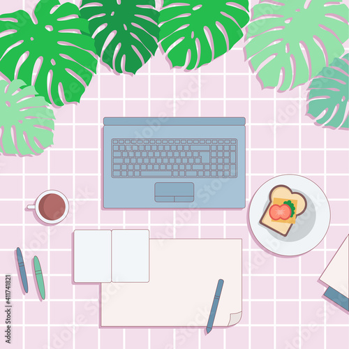 Home bathroom design interior. Bathtub filled warm water with soap bubbles and computer laptop on tray prepared for watching relax video or working vector illustration scene