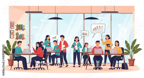 Home cleaning scene, flat vector illustration. People cleaning hall. Professional cleaner worker characters doing housework washing window, floor, vacuuming furniture. Housekeeping services.