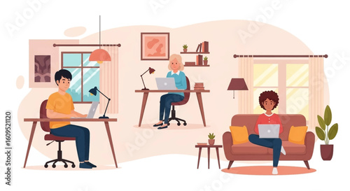 Home cleaning scene set, flat vector isolated illustration. People mopping floor, doing laundry, caring for houseplants, dishwashing, dusting, washing dog. Daily routine, cleaning company service.
