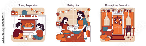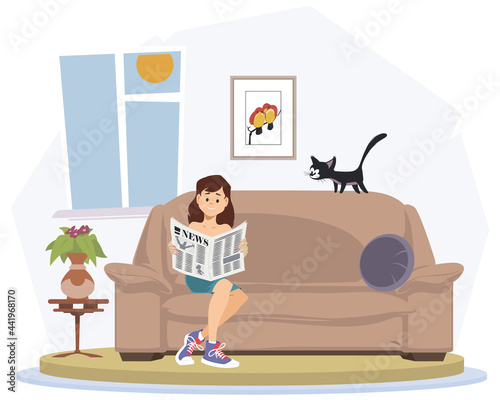 Home cosiness scene set, flat vector isolated illustration. People enjoying shopping online, spending time at home in cozy kitchen, living room with cup of cocoa, pizza, comfortable furniture, blanket